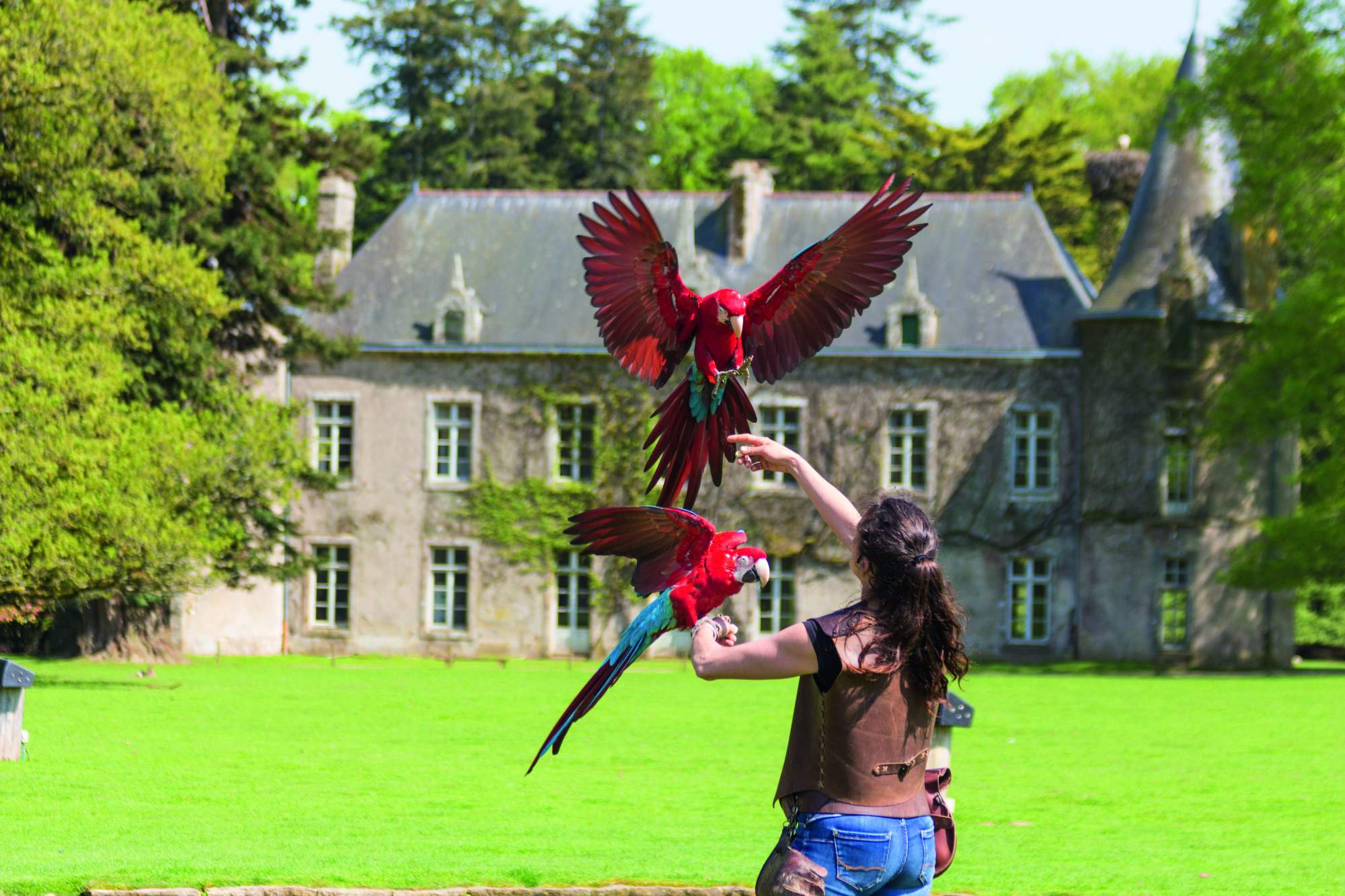 A l’affiche, cigognes, pélicans, vautours, flamants roses, perroquets… Face au château, les oiseaux en vol libre frôlent les spectateurs avec virtuosité. Un spectacle pédagogique où la complicité des fauconniers et des oiseaux est indispensable.
